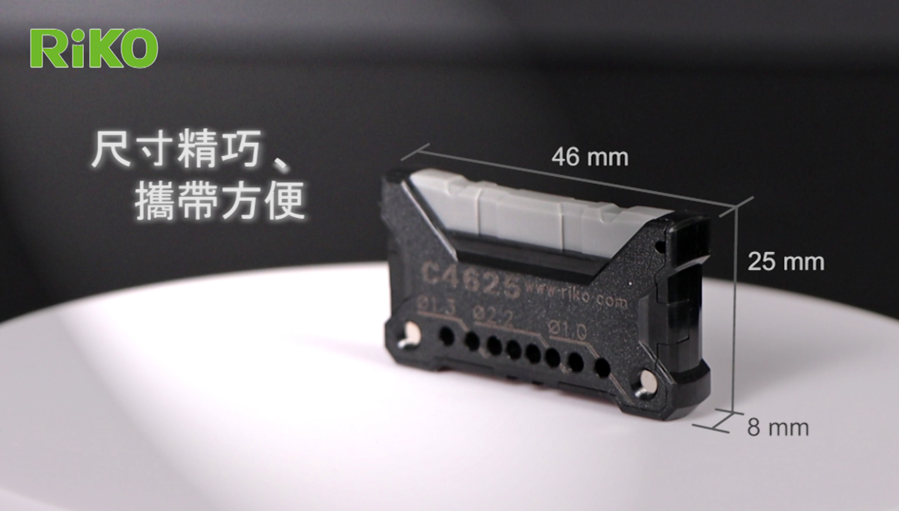 • 自動回彈、人體工學設計 (止滑紋)。 • 尺寸輕巧。 ( 46 mm x 25 mm x 8 mm ) • 三種孔位符合各式需求。( Ø1.35 mm、Ø2.35 mm、Ø1.3 mm ) • 獨特尾管限位裁切設計。 • 磁吸設計。