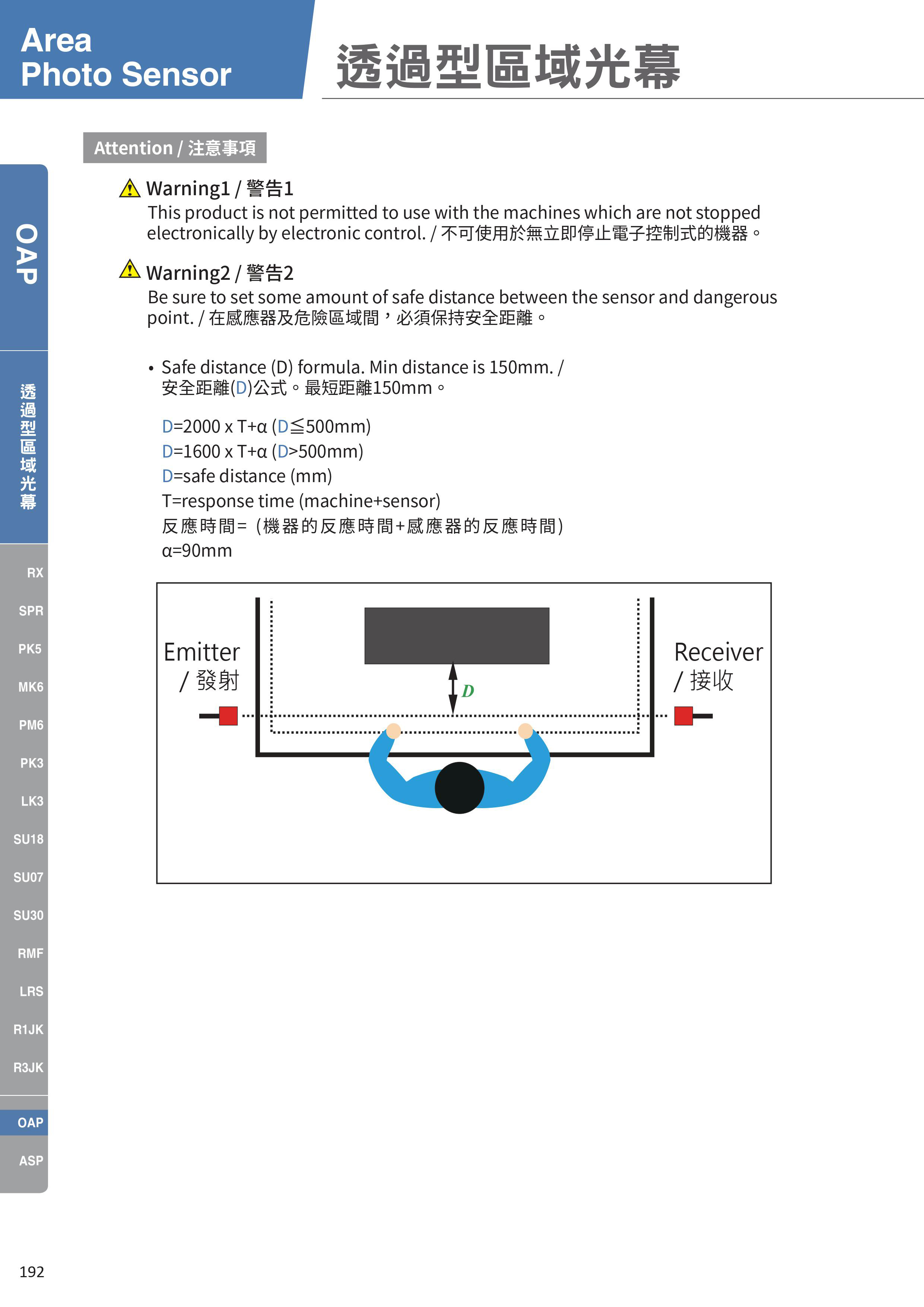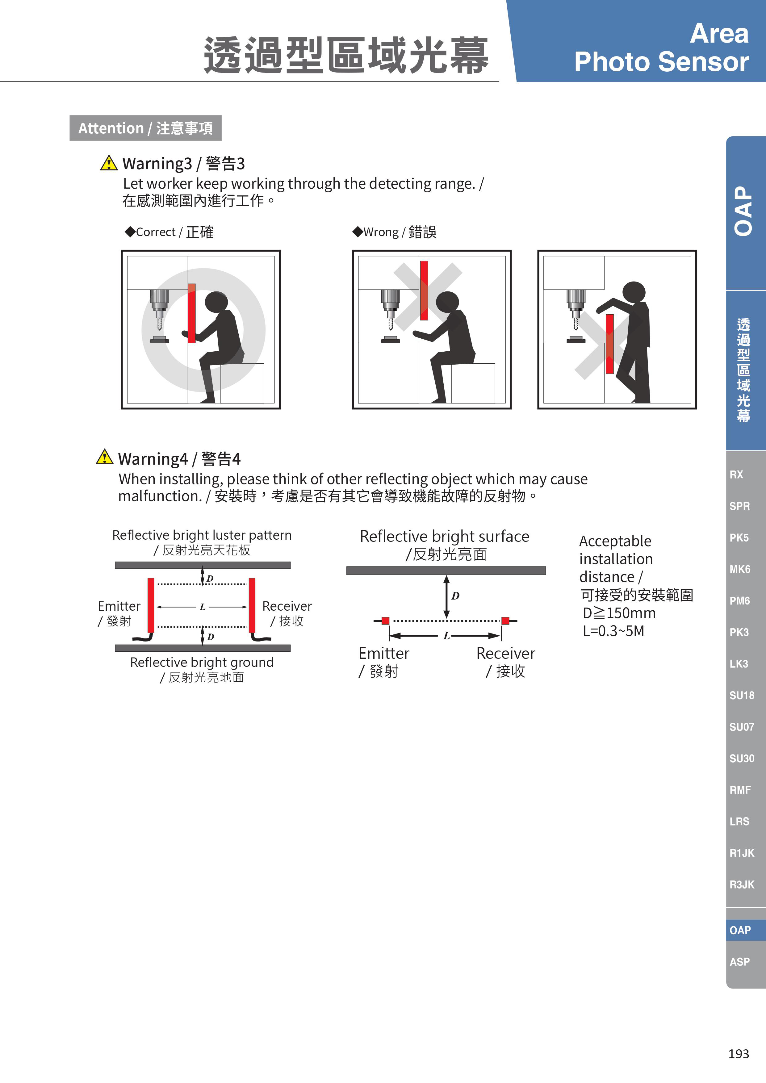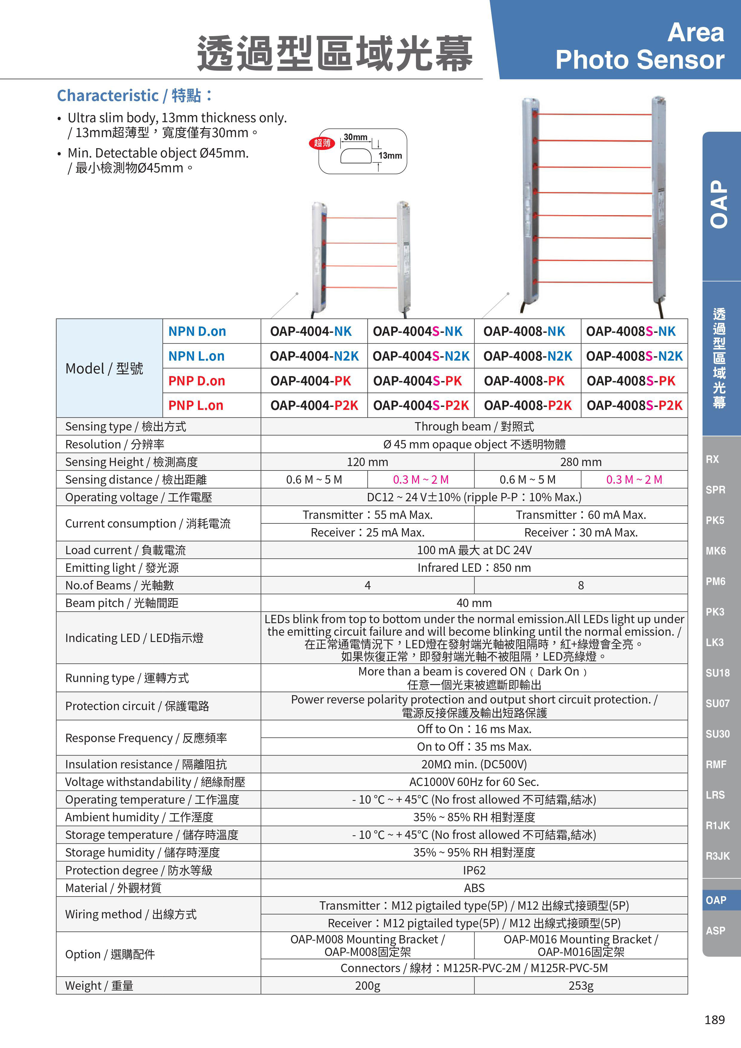 | LED指示燈 | 在正常通電情況下,LED燈在發射端光軸被阻隔時,紅+綠燈會全亮 如果恢復正常,即發射端光軸不被阻隔,LED亮綠燈 |