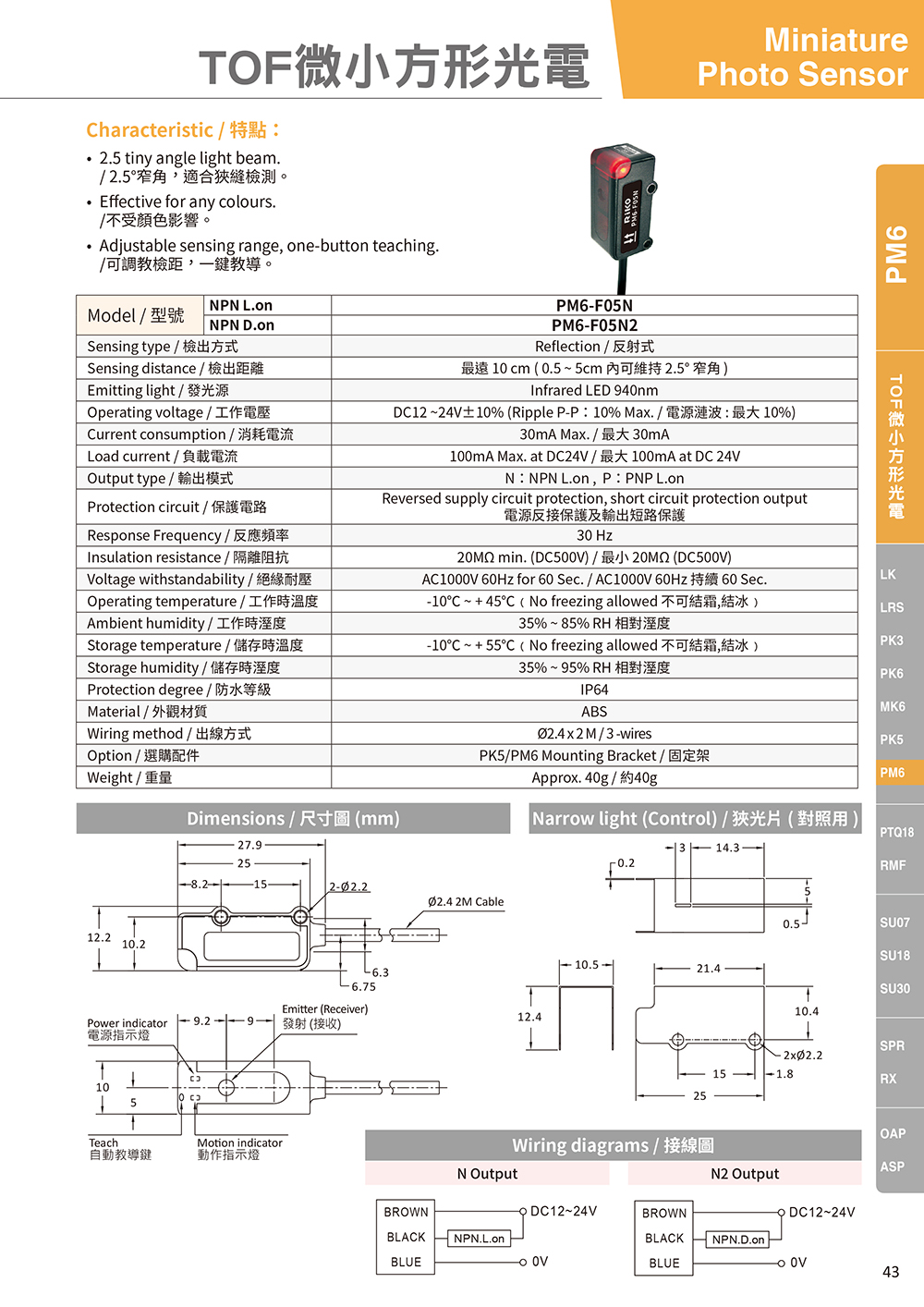 | 檢出距離 | 最遠 10 cm ( 0.5 ~ 5cm 內可維持 2.5° 窄角 ) |