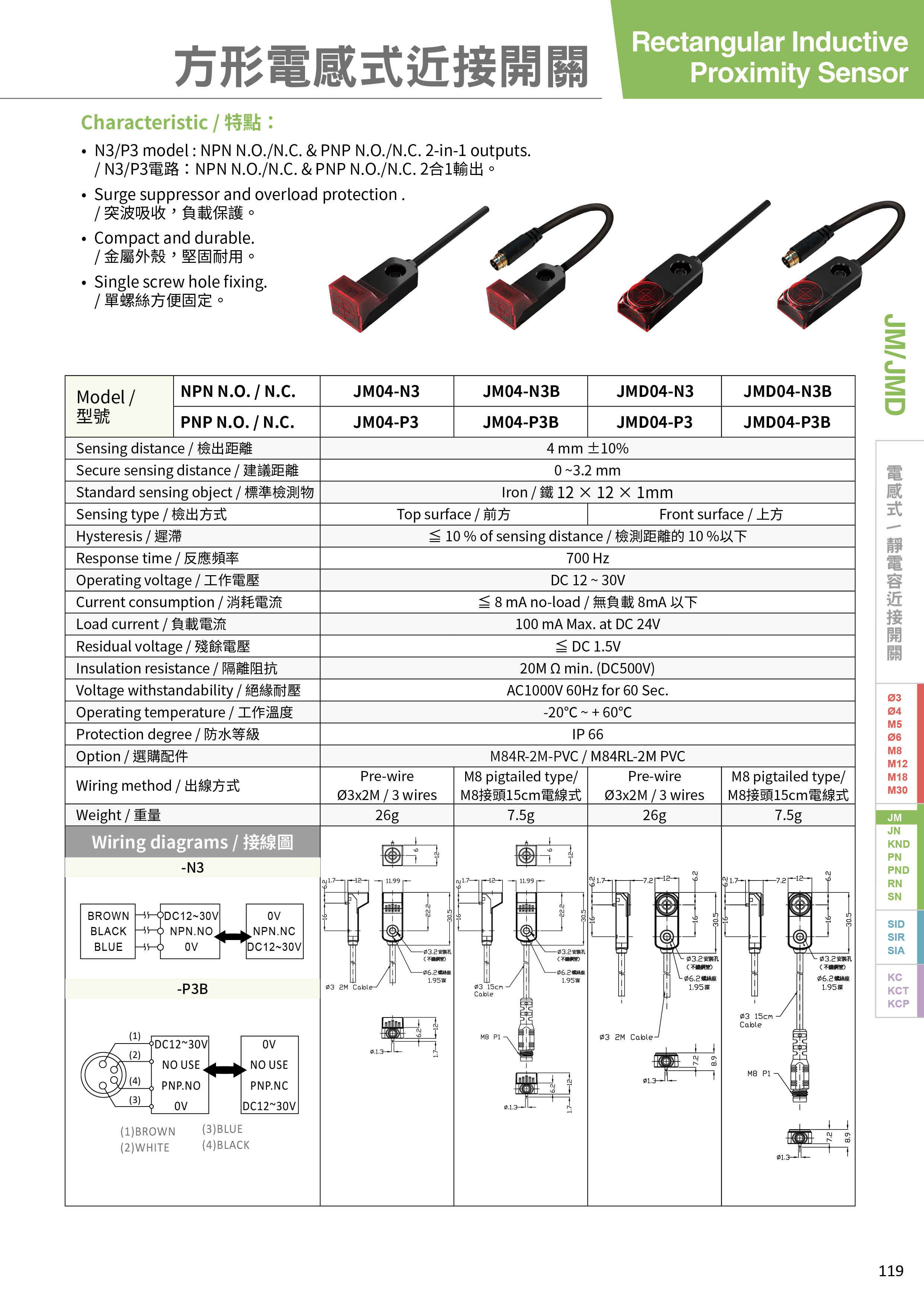 • N3/P3電路:NPN N.O./N.C. & PNP N.O./N.C. 2合1輸出