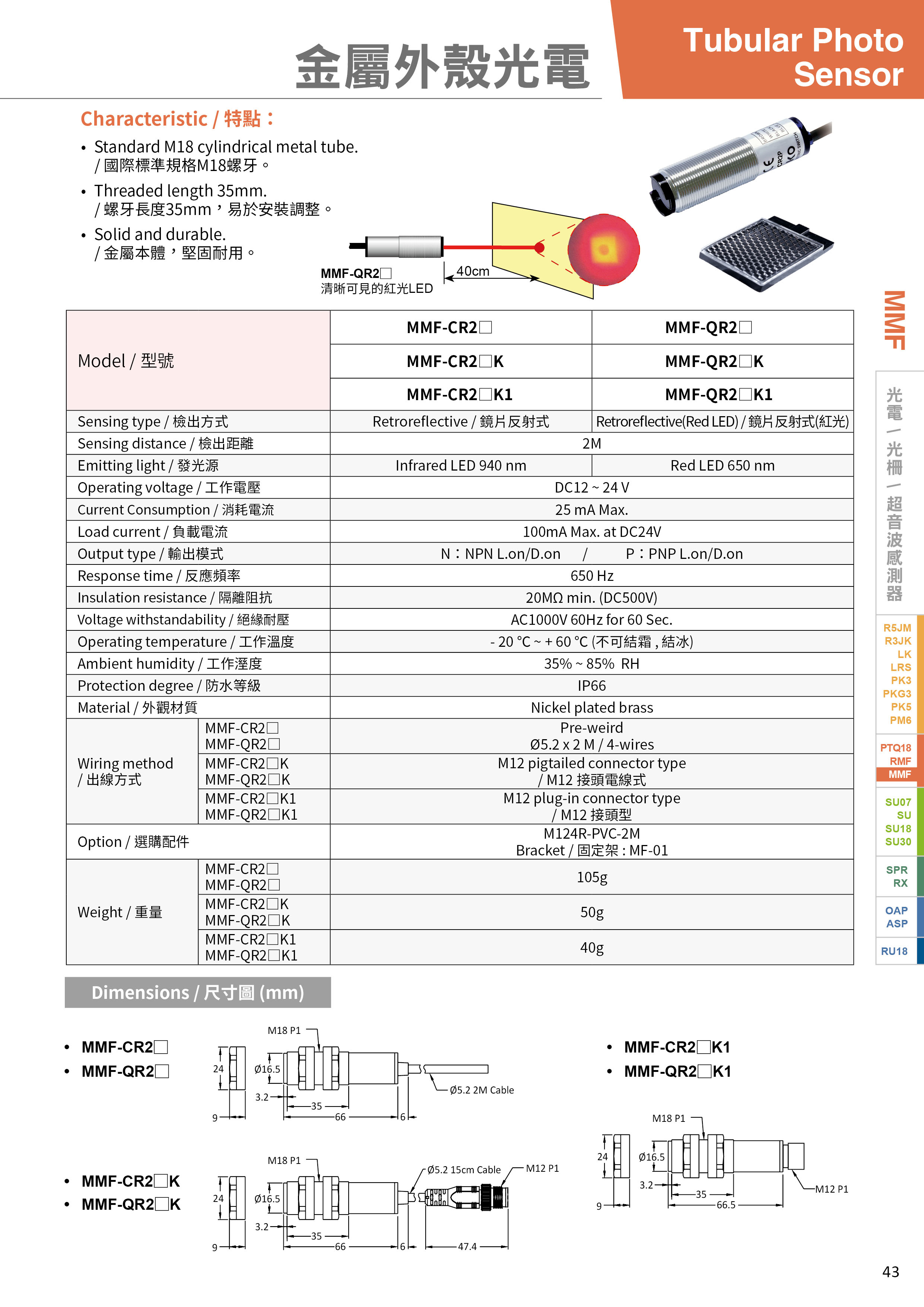 | 選購配件 | M124R-PVC-2M , Bracket / 固定架 : MF-01 |