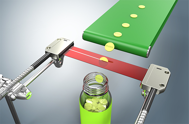 利用PT-25MLD-20區域光纖感測器多點對射的特性,可在10mm的範圍內檢查各種形狀的小藥丸落下,達到記數或報警的要求。