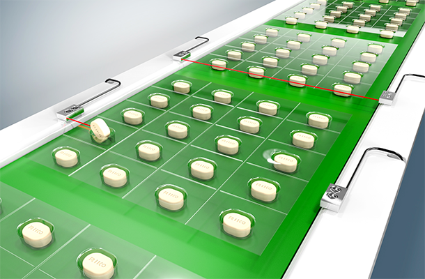 使用FTW-FU57-20對照型塑膠光纖感測器,檢測藥物是否正確放入。